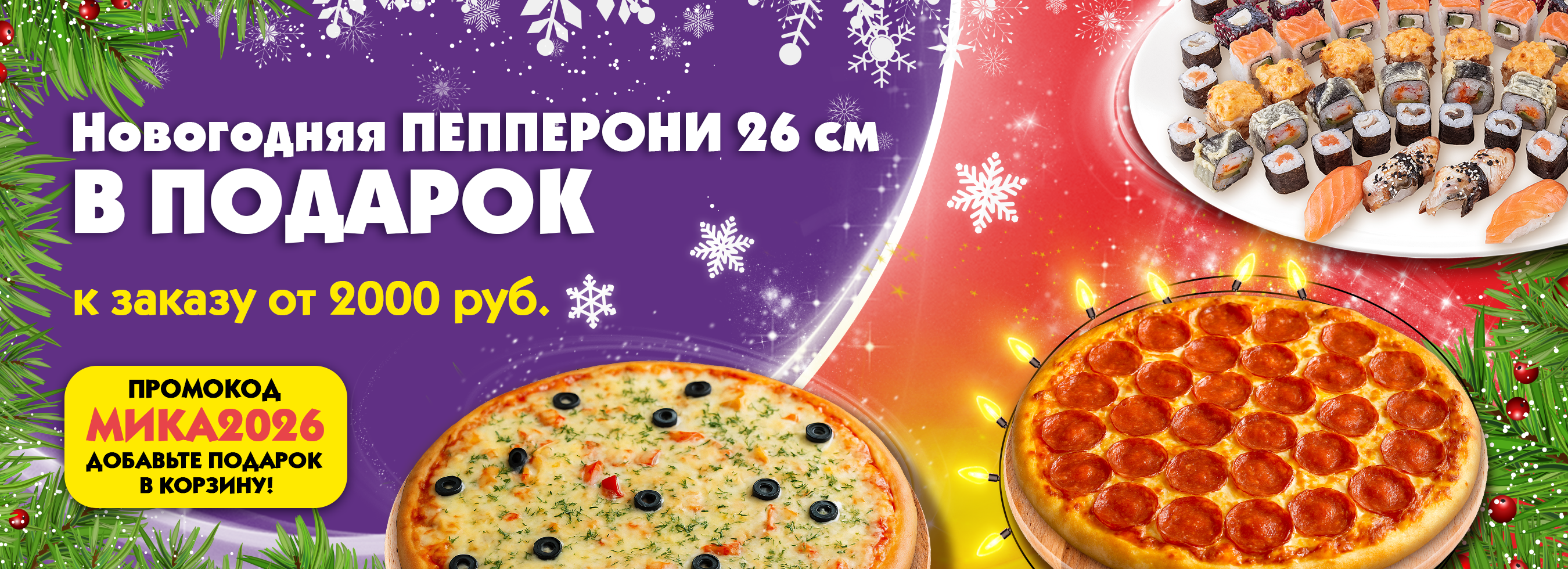 - для получения подарка положите в корзину блюдо "Пепперони в пoдарoк" и введите промокод МИКА2026 или сообщите его нашему сотруднику доставки или бара;
